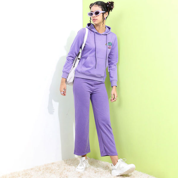 Purple solid flared track pants, has an elasticated waistband